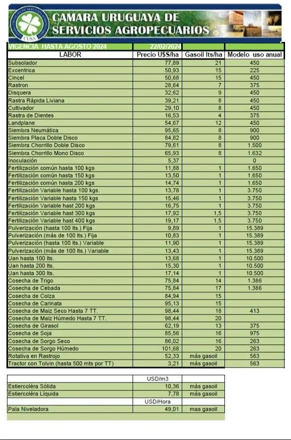 Los precios que la Cámara Uruguaya de Servicios Agrícolas (CUSA) acaba de decidir, a modo de sugerencia para las diversas labores, tuvieron un incremento en promedio muy leve, apenas un 0,74%.