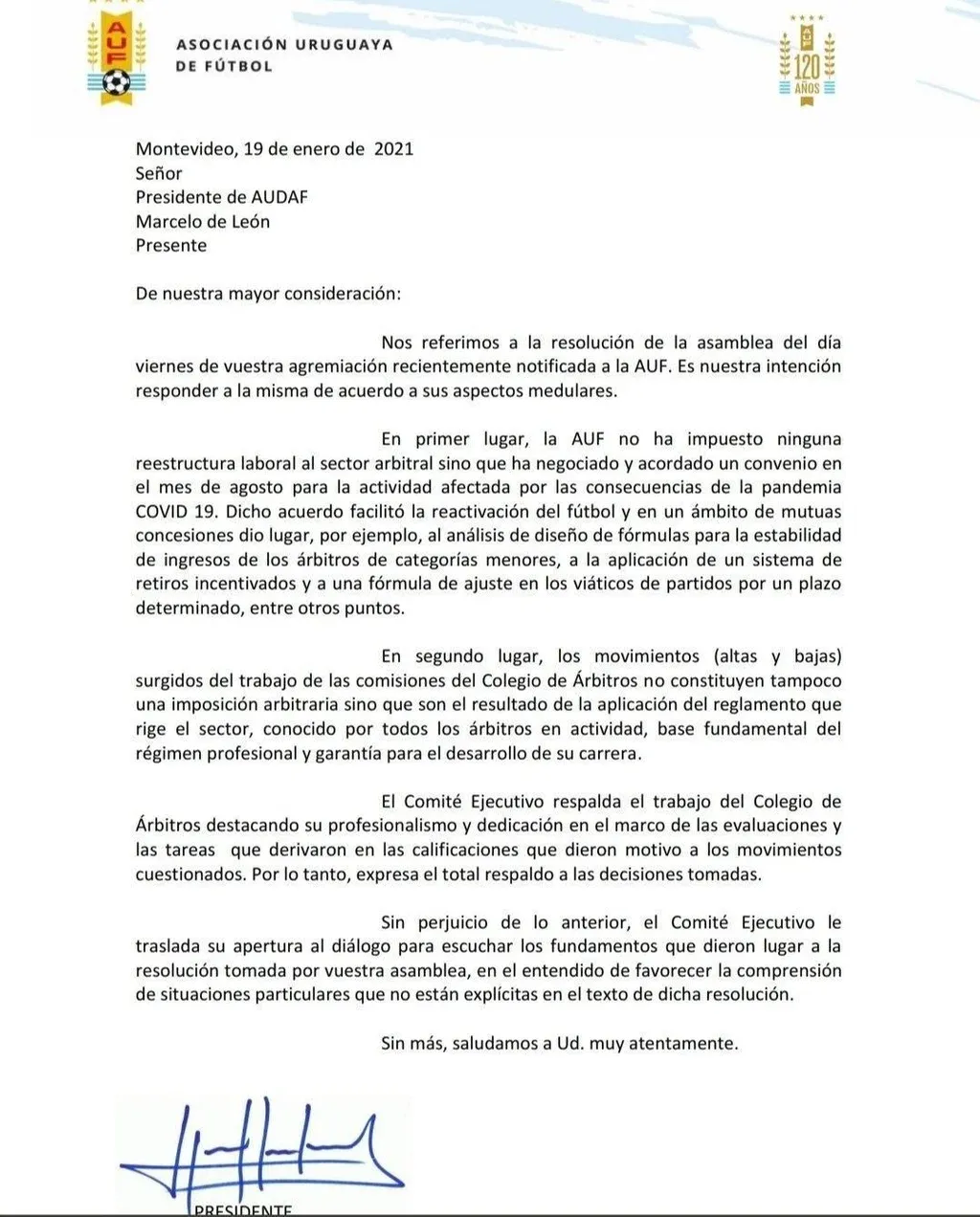 En la nota enviada el martes 19 de enero, el presidente de la AUF, Ignacio Alonso, le expresó al titular de Audaf, Marcelo de León, que compartían el criterio del Colegio para los descensos, pero que el Comité Ejecutivo le trasladaba "su apertura al diálogo para escuchar los fundamentos que dieron lugar a la resolución tomada por vuestra asamblea, en el entendido de favorecer la comprensión de situaciones particulares que no están explícitas en el texto de dicha resolución".