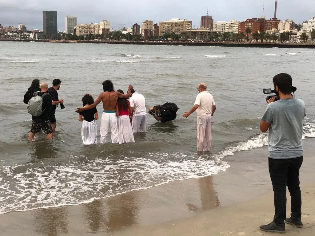 Cinco umbandistas estaban abrazados, ya dentro del agua, recibiendo el suave empuje de la marea de la playa Ramírez, y seis fotógrafos rodeaban al grupo y se movían entre las olas como si fueran parte del rito. El cielo estaba cargado de nubes, que minutos antes dejaron caer algunas gotas sobre las pocas personas dispersas en la arena y la orilla del mar. Tampoco afectó al hombre que desde la rambla y con megáfono terminaba su discurso: "Gracias por escuchar el Evangelio de Jesús".