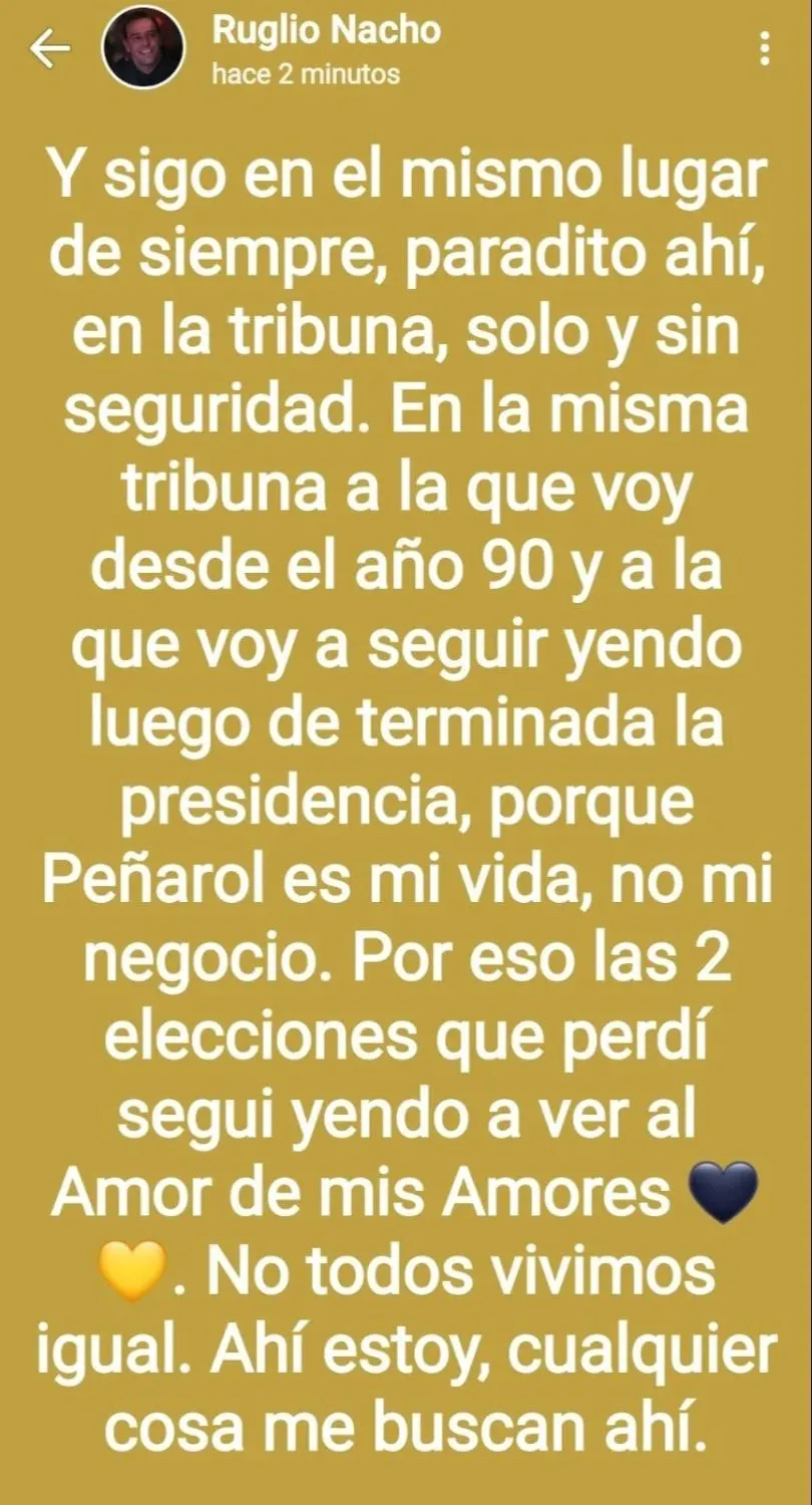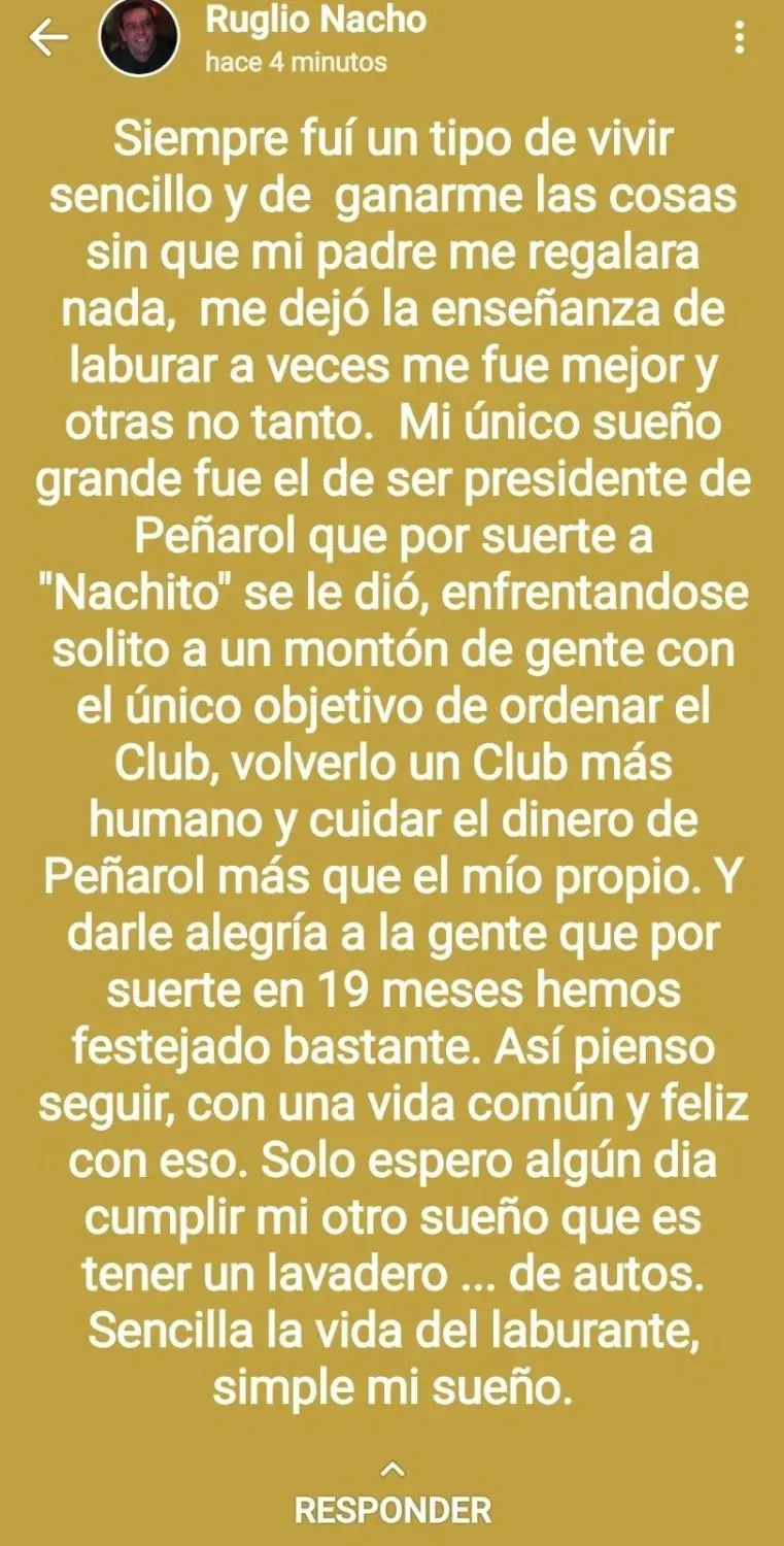Ruglio escribió lo siguiente: "Siempre fuí un tipo de vivir sencillo y de ganarme las cosas sin que mi padre me regalara nada, me dejó la enseñanza de laburar a veces me fue mejor y otras no tanto. Mi único sueño grande fue el de ser presidente de Peñarol que por suerte a 'Nachito' se le dio, enfrentándose solito a un montón de gente con el único objetivo de ordenar el club, volverlo un club más humano y cuidar el dinero de Peñarol más que el mio propio. Y darle alegría a la gente que por suerte en 19 meses hemos festejado bastante. Así pienso seguir, con una vida común y feliz con eso. Solo espero algún día cumplir mi otro sueño que es tener un lavadero... de autos. Sencilla la vida del laburante, simple mi sueño".