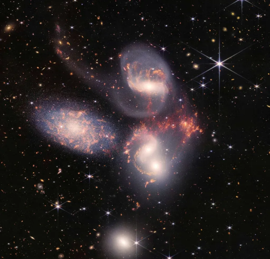 Mucho más lejos — a 300 millones de años luz — se puede ver un grupo compacto de galaxias conocido como el Quinteto de Stephan "enfrascado en una danza cósmica en la que dos de ellas se están fusionando", dijo Giovanna Giardino, una científica de la Agencia Espacial Europea que trabaja en el Webb.