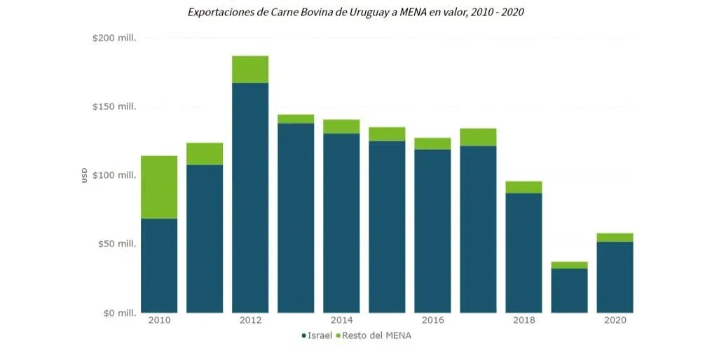 Exportaciones de carne bovina de Uruguay a MENA en valor, 2010-2020: