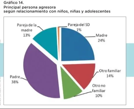 Quienes ejercen violencia contra los niños, niñas y adolescentes se tratan de en primer lugar del padre (38%), seguido por la madre (24%). Luego aparece otro familiar (14%) y la pareja de la madre (13%). "9 de cada 10 personas agresoras corresponden a familiares directos o integrantes del núcleo de convivencia de niños, niñas y adolescente", asegura el organismo.