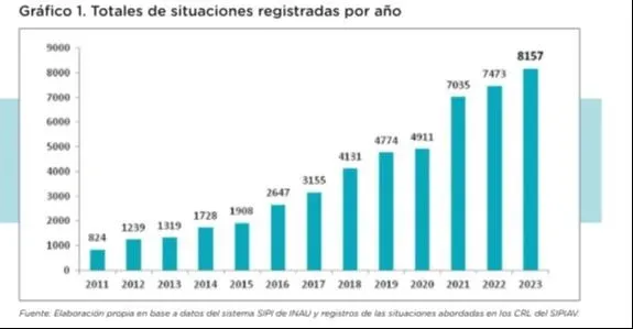 Según el informe de Sistema Integral de Protección a la Infancia y a la Adolescencia contra la Violencia (Sipiav), se registró un aumento del 9% del 2023 con respecto a 2022, lo que marca, según INAU, que hay mayor una detección e intervención ante los casos.
