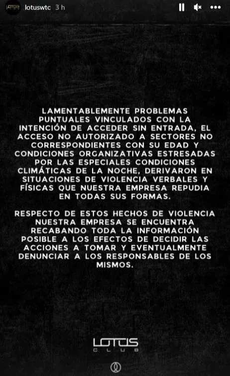 “Lamentablemente, problemas puntuales con la intención de acceder sin entrada, el acceso no autorizado a sectores no correspondientes y condiciones organizativas estresadas por las especiales condiciones climáticas de la noche derivaron en situaciones de violencia verbales y físicas que nuestra empresa repudia en todas sus formas”, expresó.