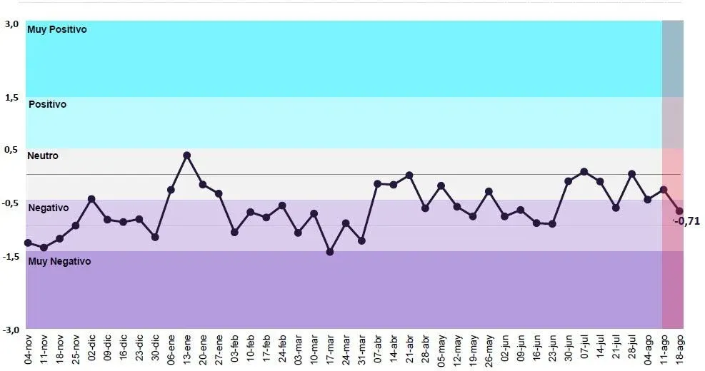 Munyo compartió el índice desde noviembre de 2018 hasta la primera semana de agosto. "El impacto de los influencers desde noviembre fue entre negativo y neutro, y eso va en línea con indicadores duros de la economía uruguaya", explicó el director del Centro de Economía del IEEM. A modo de ejemplo, el cierre del histórico acuerdo entre la Unión Europea y el Mercosur tuvo un impacto neutro, y la estatización de Montevideo Gas ubicó al índice en la franja negativa.