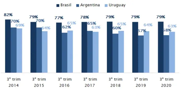 Al comparar el nivel de capacidad ociosa de la industria en relación con los países de la región, la CIU observó que la utilización de la capacidad instalada de Brasil se mantuvo estable en relación al mismo trimestre de 2019. Por su parte, Argentina evidenció un leve crecimiento, de 1%, en igual comparación.