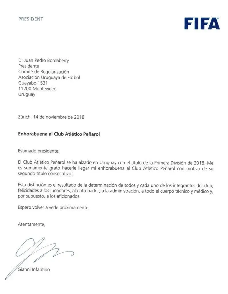 "El Club Atlético Peñarol se ha alzado en Uruguay con el título de la Primera división de 2018. Me es sumamente grato hacerle llegar mi enhorabuena al Club Atlético Peñarol con motivo de su segundo título consecutivo!", escribió Infantino en una carta enviada al presidente del Comité de Regularización de la AUF, Pedro Bordaberry.