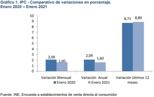 Los precios aumentaron 1,6% durante el primer mes del 2021, dejaron el dato anualizado en 8,89% y pautó el cuarto descenso mensual consecutivo de la inflación. El Índice de Precios del Consumo (IPC) avanzó 1,6% en enero, por debajo 2,09% del mismo mes del año pasado, según informó este miércoles el Instituto Nacional de Estadística (INE).