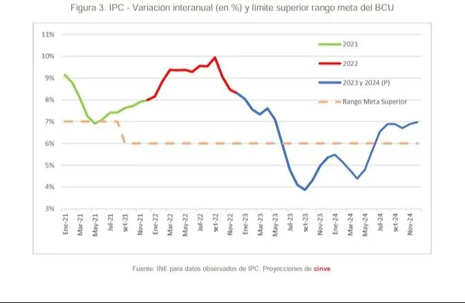 El Centro de Investigaciones Económicas (Cinve), señaló la semana pasada que espera que la inflación siga dentro del rango meta hasta mitad de 2024, y que a partir de julio alcanzaría cifras de entre 6% y 7%, adoptando forma de “W”. Para 2025 se proyecta un cierre anual de 7,3%, según el informe al que accedió El Observador.