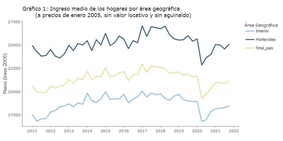 Por ejemplo, la mediana de ingreso de los hogares, que alcanzó los $ 59.176, puede descomponerse en $69.977 para la capital y $53.317 para el resto del territorio. A pesar de ello, este número en particular mejoró mucho más fuera de Montevideo — $3.000 (6,0%) versus $1.621 (2,4%)—. Días atrás, el Centro de Estudios para el Desarrollo (CED) publicó un informe en el que afirmó que el interior del país absorbió el 90% del empleo generado en 2021.