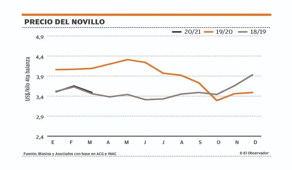 El ternero y el novillo gordo mantuvieron un comportamiento similar. En el primer semestre del ejercicio el novillo gordo promedió por encima de los US$ 4 por kilo en cuarta balanza. A partir de abril de 2020 los precios comienzan a bajar y fueron inferiores en la comparación interanual. En promedio, en todo el ejercicio el precio del novillo gordo alcanzó los US$ 3,75 por kilo, un 11,5% más que en el mismo período del año pasado.