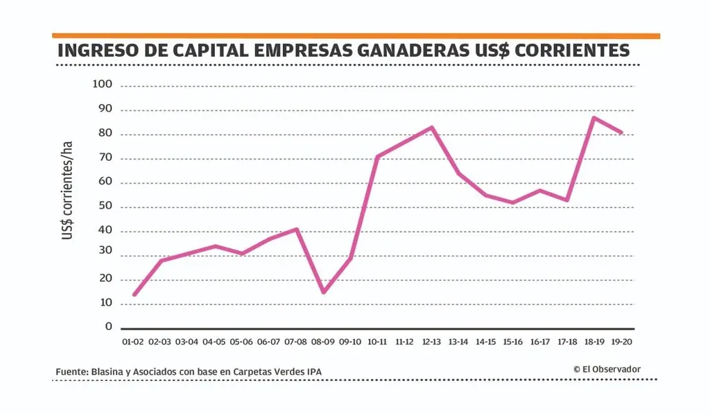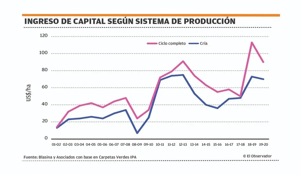 El ingreso de capital promedio de las empresas ganaderas, antes de pagar renta e intereses, fue de US$ 81/ha en el ejercicio 2019/20, algo menos que en el ejercicio previo, que había sido el mejor resultado en 19 años de registros (US$ 87/ha), tras cuatro años consecutivos con márgenes reducidos –de US$ 50/ha a US$ 60/ha–.