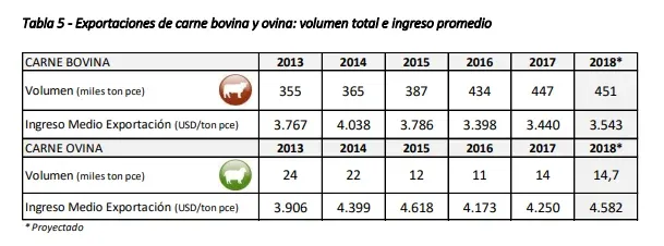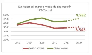 El ingreso medio por exportaciones de carne bovina en promedio en 2018 se crecería cerca de un 3%, ubicándose próximo a US$ 3.543 por tonelada peso canal equivalente.