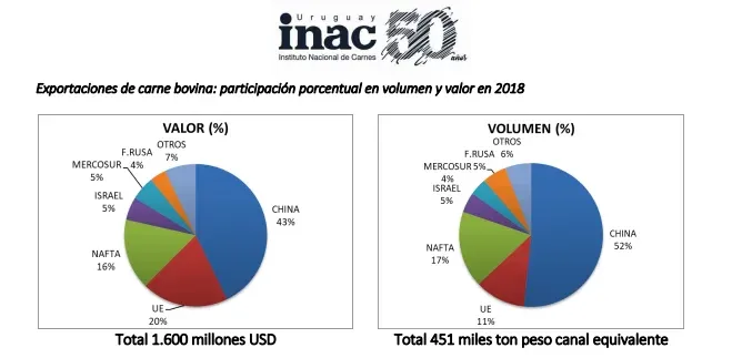 Los tres principales mercados (China, UE, y Nafta que contribuye con el 16% del volumen) completan el 80% de la carne bovina exportada.