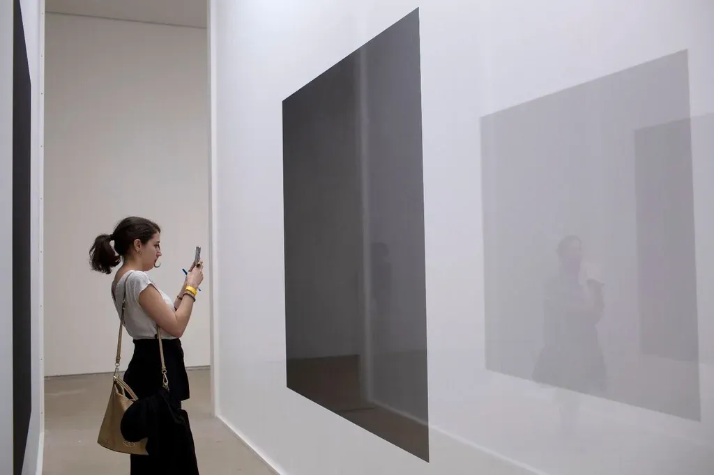 Los aparatos arquitectónicos de Lamelas –como una pared caída apoyada en una estructura de madera– abren los trabajos, seguidos de la etérea instalación “Black³” de Irwin: una sala clara con dos cuadrados negros en paredes opuestas, separadas por varias telas.