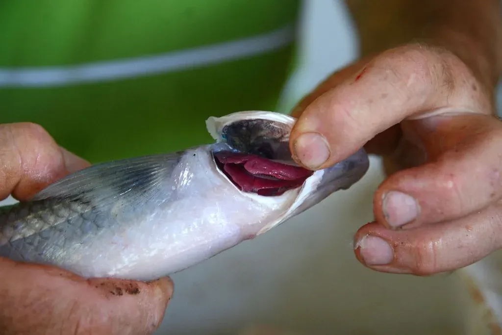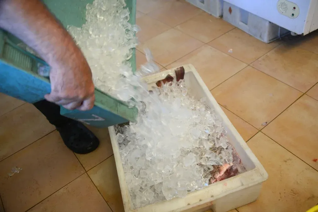 En la pescadería de Punta Carretas, De Piero exhibe una corvina negra que pescó esa mañana de enero. Gracias al corte que tiene sobre el cuello, se distinguen sus agallas de un rojo bien intenso. El pescador apoya este animal –que pronto se convertirá en manjar de algún comensal– sobre la mesada y empieza a limpiarlo con un cepillo y abundante agua para luego refrigerarlo como corresponde y, a las horas, venderlo. No toca con la cuchilla los intestinos, porque estos desprenden jugos gástricos que pueden contaminar la carne, entonces, los quita enteros y prosigue a retirar una capa de membrana que bordea la pulpa internamente. Una vez limpia, la corvina pasa a otro recipiente con abundante hielo encima.