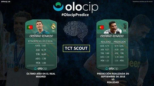 El ejemplo de Ronaldo y Benzemá En sus redes sociales, Olocip informa de sus estimaciones sobre distintos futbolistas de la actualidad. Y en una de ellas, durante el congreso internacional World Football Summit, hizo una predicción sobre cómo le iba a ir a Cristiano Ronaldo en su primer año en Juventus. Tal como habían estimado, el portugués hizo menos goles y dio más asistencias. A la vez, se predijo que la salida de CR7 llevaría a hacer más goles a Benzemá, como ocurrió.