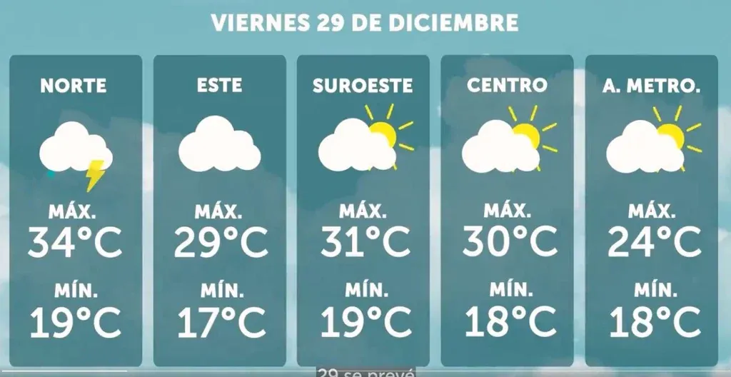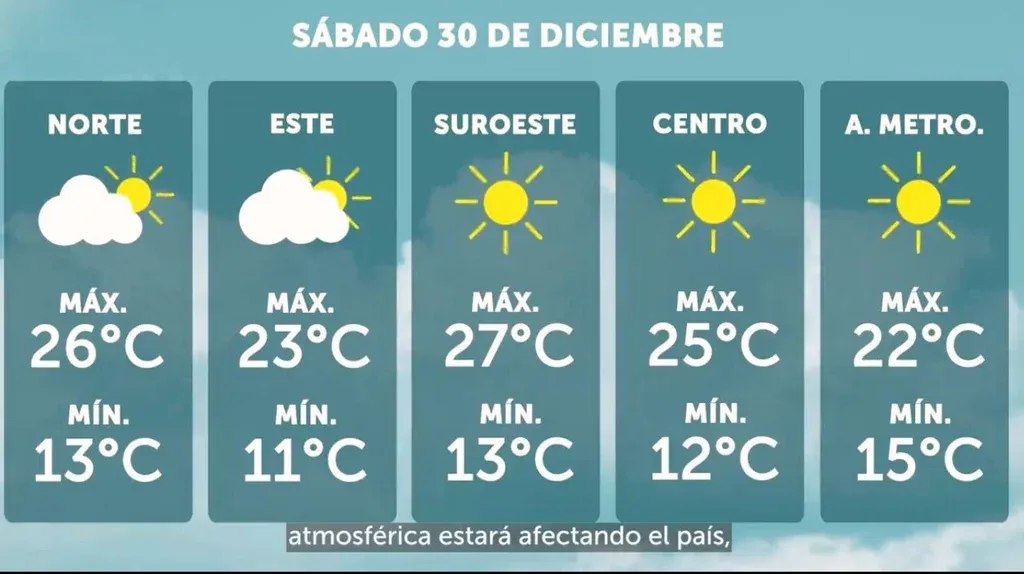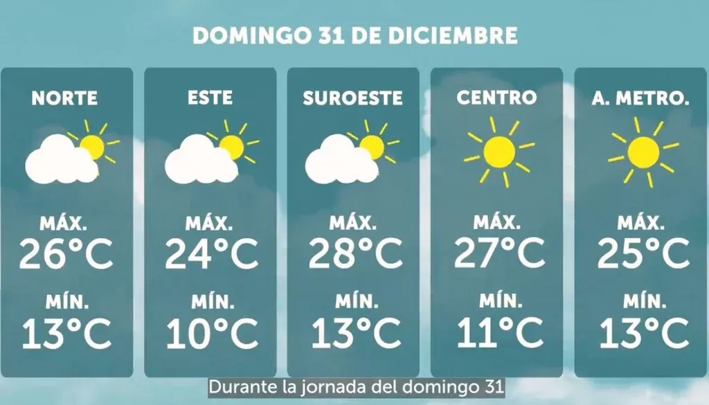 Inumet El pronóstico para el 30 de diciembre Para el domingo 31, cuando se celebra Fin de Año, "se mantiene el sistema de alta presión con un leve ascenso en las temperaturas máximas con el cielo algo nuboso". Las temperaturas irán desde los 10°C hasta los 28°C.