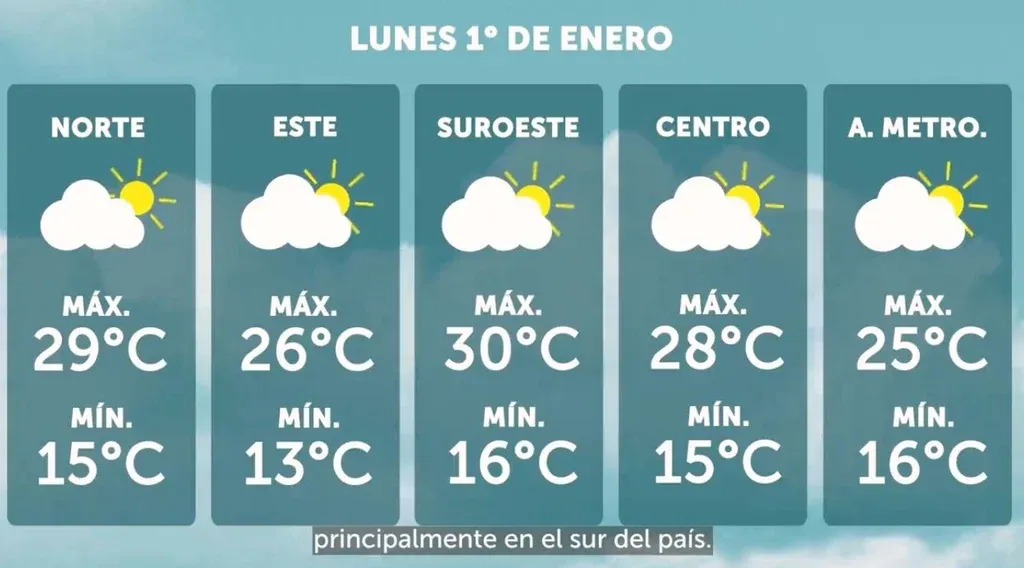 Inumet El pronóstico para el 31 de diciembre El lunes 1° de enero, para Año Nuevo, se espera un "aumento de la nubosidad, principalmente en el sur". "Para la costa este se mantiene una probabilidad baja de precipitaciones". Las temperaturas irán desde los 13°C hasta los 30°C.