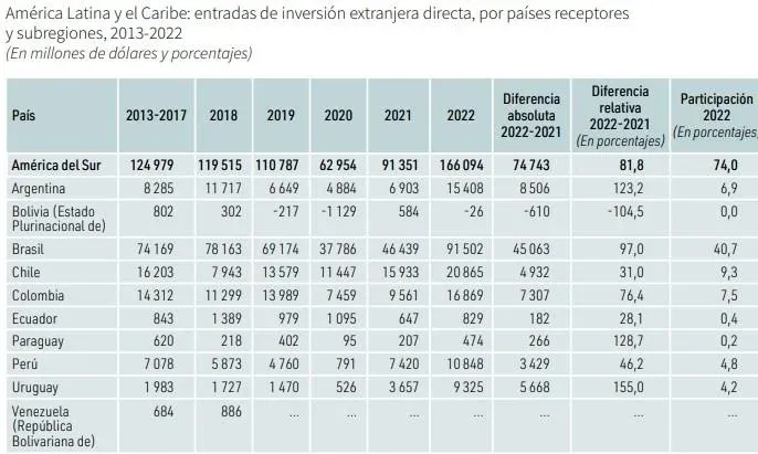 El informe indicó que desde 2013 las entradas de inversión extranjera directa en la región no superaban los US$ 200.000 millones, lo que transformó la recuperación de 2022 en un hito importante para las inversiones de la última década. Esa recuperación se constató en las principales economías receptoras y se caracterizó por un fuerte interés en inversiones en servicios, un renovado interés en las inversiones en hidrocarburos y la continuidad de las realizadas en manufacturas en los países donde se han acumulado mayores capacidades.