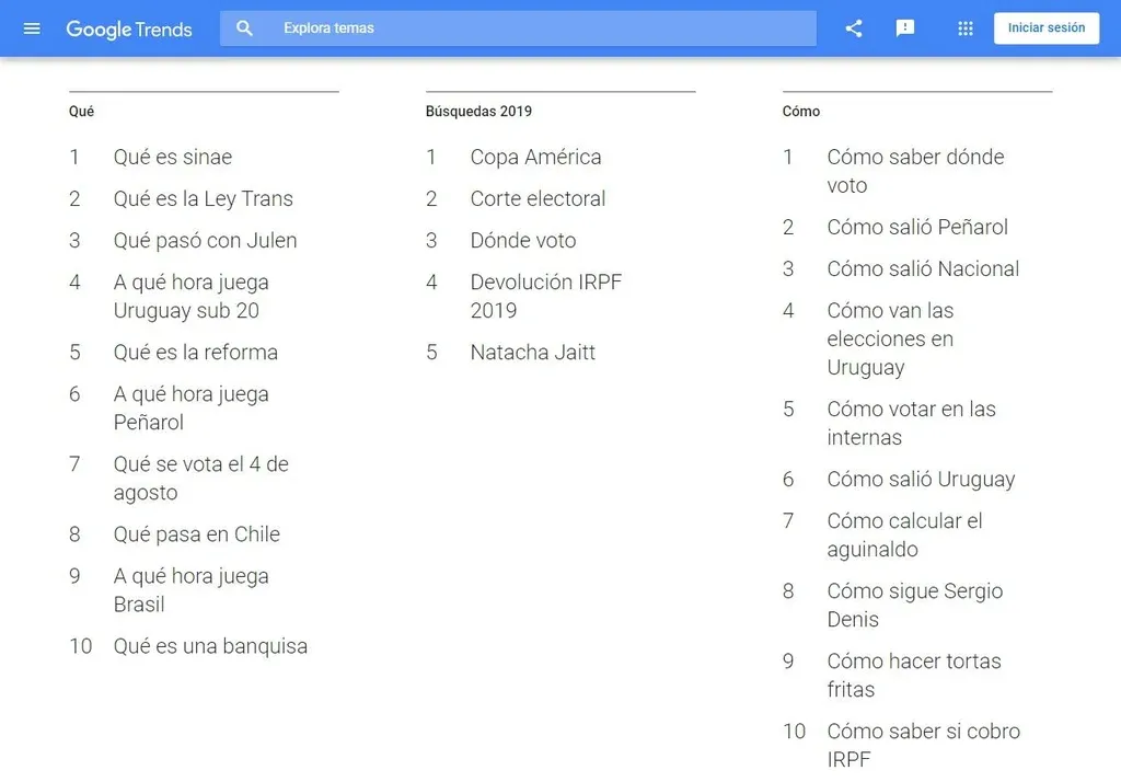 Entre las búsquedas generales de los uruguayos, el tema más indagado fue la Copa América de Brasil, de la que Uruguay quedó afuera por penales a manos de Perú. Le siguió la "Corte Electoral", "Dónde voto", "Devolución IRPF 2019" y Natacha Jaitt, la mediática argentina que murió en febrero de este año.