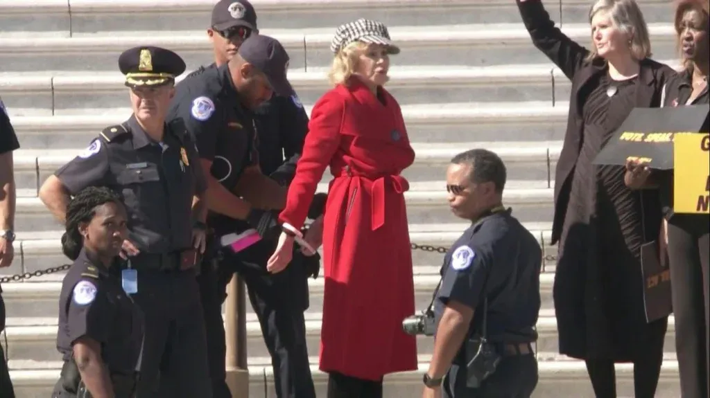 La oscarizada actriz Jane Fonda fue arrestada el viernes frente al Capitolio de Estados Unidos, donde protestaba contra el cambio climático y exigía medidas para proteger el medio ambiente.