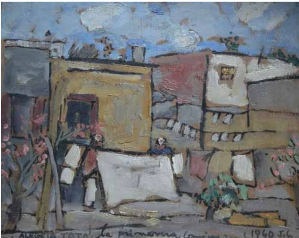 Continua a una sala con una exposición de obras referentes al Cerro, barrio donde se la familia vivió luego de llegar de Lituania a Barrio Sur, hay una pequeña sala en homenaje a su esposa: Julia “Totó” Añorga. “Era medio romántico mi padre", comenta Martín con una sonrisa. La selección exhibe obras que Gurvich le regaló a su compañera, cada una con una dedicación especial. "Mi madre era profesora de historia y de francés en Las Piedras, a veces volvía muy cansada al Cerro, molida del trabajo, y mi padre una vez para levantarle el ánimo le hizo esta obra. Cuando llegó le dijo 'esto es para ti'". El pequeño óleo sobre cartón pintado en 1960 muestra un paisaje colorido y cotidiano, pero tiene debajo un mensaje para su esposa: "¡Alegría Totó! La primavera comienza".