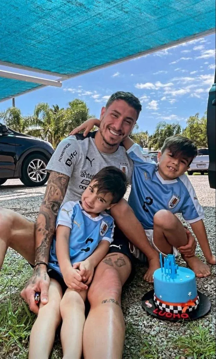 Así se pudo ver al futbolista junto a su pareja Regina Lafolla, el hijo mayor Lautaro y el pequeño cumpleañero, ambos con las camisetas de Uruguay.
