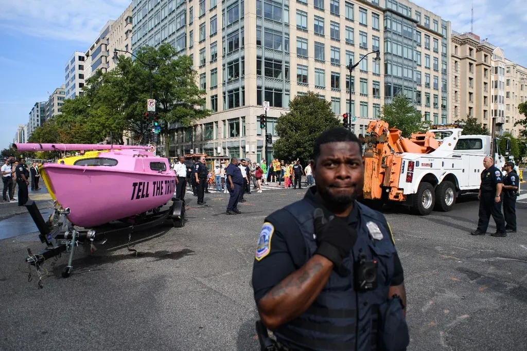 A pocas calles de la Casa Blanca, Extinction Rebellion (XR) instaló un pequeño velero en la gran avenida K Street para simbolizar la crecida de las aguas que, según esta organización, amenaza la capital estadounidense, bordeada por el río Potomac.