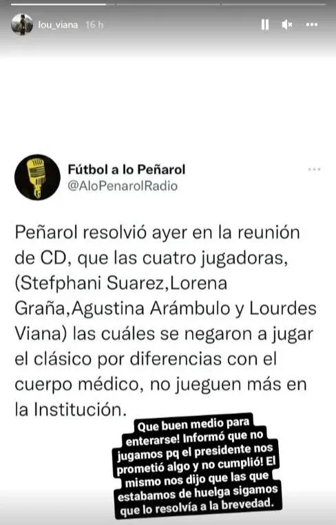 El descargo de Lourdes Viana "Íbamos a jugar el clásico el 8 de mayo y estábamos todas las jugadoras de paro, todo el plantel. A los tres días el cuerpo técnico (encabezado por Felipe Rebollo) nos reúne y nos dice que se venía el clásico y había que entrenar, nos pusieron presión. Desde principio de abril nosotras cuatro dijimos que íbamos a seguir con la medida, que si no se cambiaba la sanidad no íbamos a volver a las prácticas. Esa fue nuestra decisión desde hace un mes y medio, y teníamos la esperanza de que se cambiara. Ni siquiera el cuerpo técnico se comunicó con nosotras para preguntar cómo veníamos con los entrenamientos, porque nosotras entrenábamos por nuestra cuenta. No tuvimos comunicación de parte del cuerpo técnico ni nadie. Faltando una semana para el clásico dijimos que si no estaba nada resuelto y sin haber entrenado con el equipo no creía que nos fueran a convocar. Ahí empezamos a darnos fuerza para afrontar lo difícil que es ver el clásico sin jugarlo, más que nosotros nadie quería jugarlo", expresó.