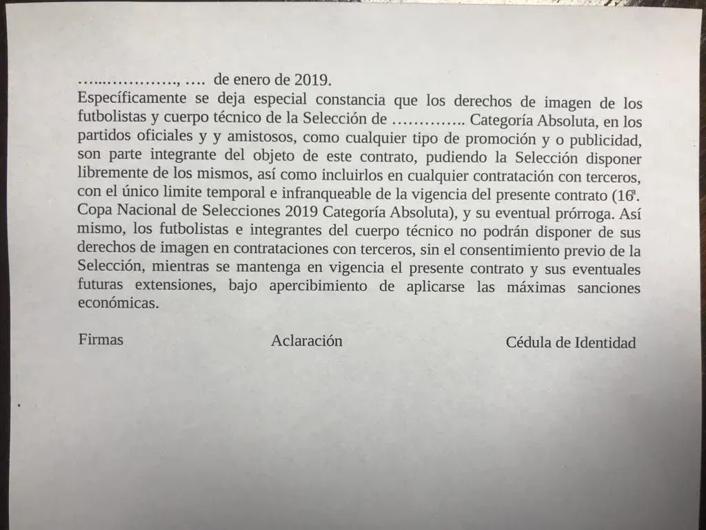 Referí tuvo acceso a unos de los documentos donde dice: “Específicamente se deja especial constancia que los derechos de imagen de los futbolistas y cuerpo técnico de la selección de… en los partidos oficiales y amistosos, como cualquier tipo de promoción o publicidad, son parte integrante del objeto de este contrato pudiendo la Selección disponer libremente de los mismos, así como incluirlos en cualquier contratación con terceros, con el único límite temporal e infranqueable de la vigencia del presente contrato (Copa Nacional de Selecciones 2019), y su eventual prórroga. Así mismo, los futbolistas e integrantes del cuerpo técnico no podrán disponer de sus derechos de imagen en contrataciones con terceros, sin el consentimiento previo de la Selección, mientras se mantenga en vigencia el presente contrato y sus eventuales futuras extensiones, bajo apercibimiento de aplicarse las máximas sanciones económicas”.