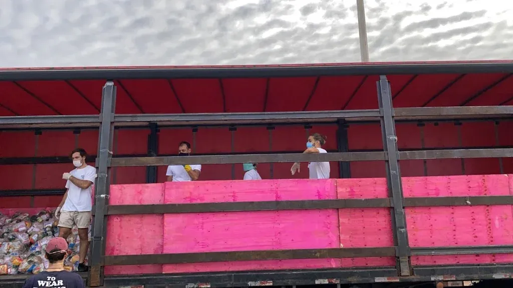 Con tapabocas, los integrantes del plantel y del cuerpo técnico tricolores formaron una cadena humana para llevar las canastas desde los contenedores en las que estaban hasta el camión de distribución.