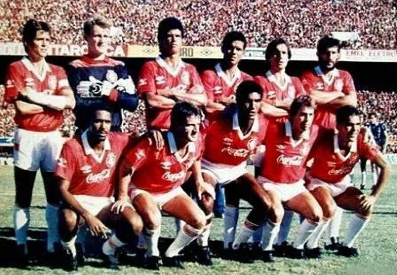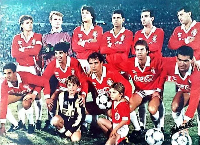 El equipo de Internacional de Porto Alegre que le ganó los dos partidos a Peñarol en la Copa Libertadores de 1989; arriba, Luis Carlos Winck, Taffarel, Norton, Norberto, Casemiro, Óscar Aguirregaray y abajo, Heider, Luis Fernando Flores, Diego Aguirre, Luis Carlos Martins y Edu Lima