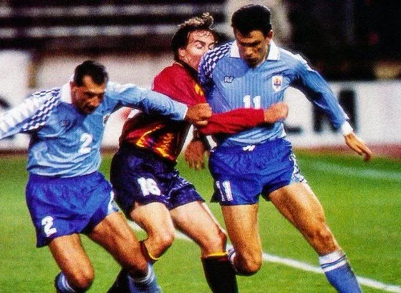 El debut de Óscar Aguirregaray con la selección uruguaya; fue ante España en un 2-2 en enero de 1995; en la foto, junto a Gustavo Poyet, marcan a Losada