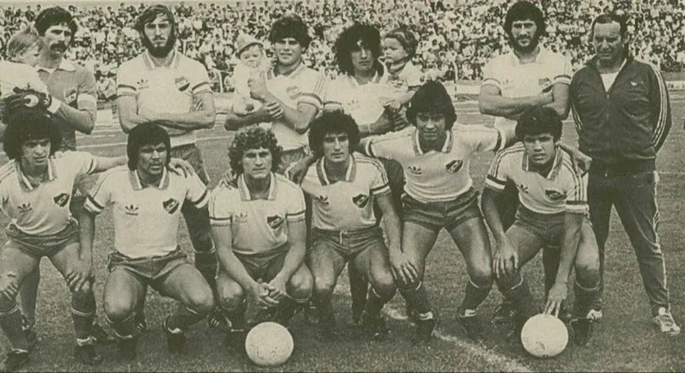El equipo de Nacional que dio la vuelta olímpica como campeón uruguayo en 1983 en el Gran Parque Central; arriba, Rodolfo Rodríguez, José Aja, Wilson Graniolatti, José Hermes Moreira y Óscar Aguirregaray; Carlos Aguilera, Washingon González, Carlos Berrueta, Pedro Pedrucci, Arsenio Luzardo y Jorge Villazán