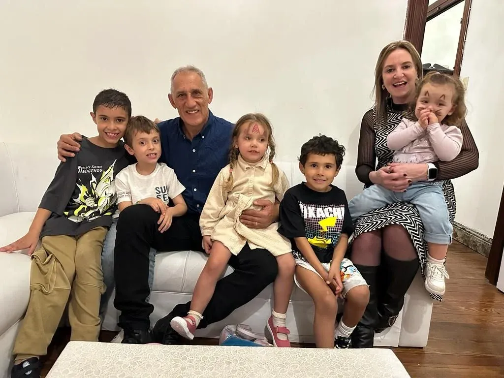 Óscar Aguirregaray junto a su esposa Patricia y sus nietos Valentino, Tabaré, Nazario, Jazmín, Luciano y Antonia; falta Genaro en la foto