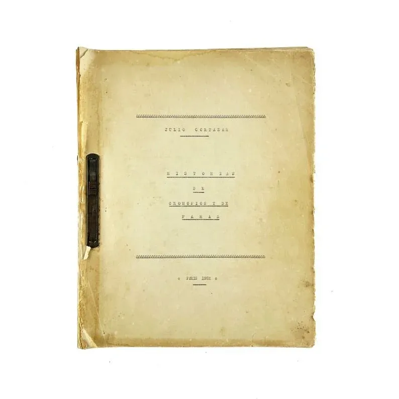 Pero bien al fondo la caja ordinaria se escondía un conjunto de textos de mecanografiados con correcciones a mano. En tapa una escritura desconcertante: Julio Cortázar. Historias de Cronopios y de Famas. París 1952.