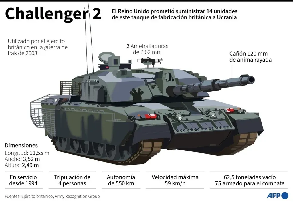 El Reino Unido tiene previsto enviar a Ucrania un total de 14 tanques Challenger. En su mensaje de Twitter, Reznikov no especificó el número de blindados que llegaron ya a Ucrania.