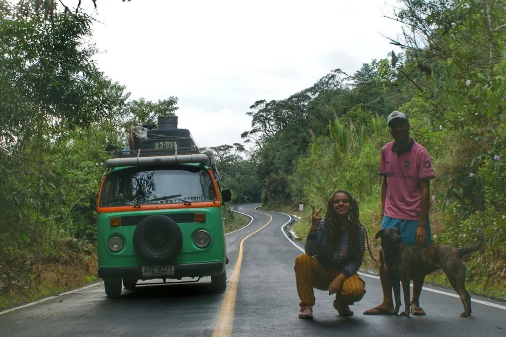 El viaje tuvo su punto de partida en la ciudad de Los Cerrillos, en Canelones. Ellos mismos, pareja desde hace más de diez años, refaccionaron su Volkswagen Combi hasta “transformarla en casa”. Cuentan con una reserva de agua de 80 litros, generadores solares para ser autosuficientes mediante energía eléctrica, cocina con horno, heladera y hasta baño químico. Además, los acompaña Manchita, o “La Manchi”, su perra de cinco años de edad.