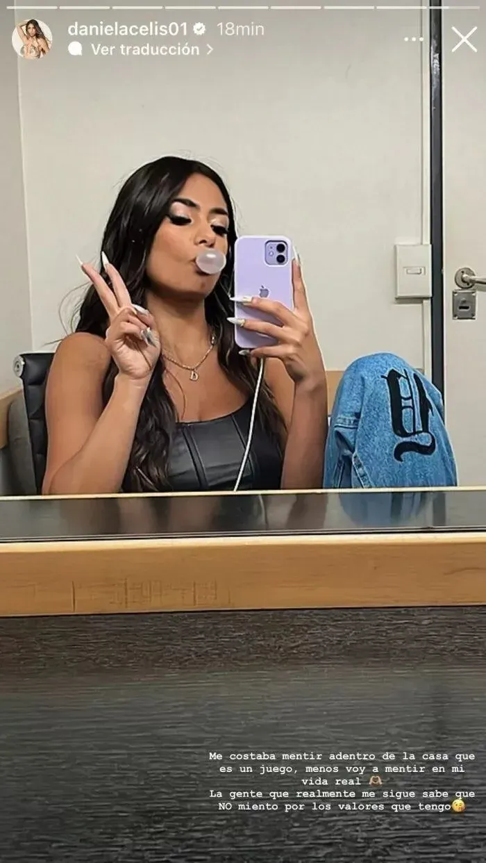 "Me costaba mentir adentro de la casa, que es un juego, menos voy a mentir en mi vida real. La gente que realmente me sigue sabe que NO miento por los valores que tengo", publicó después la ex integrante del reality en un claro mensaje hacia el cantante de cumbia.