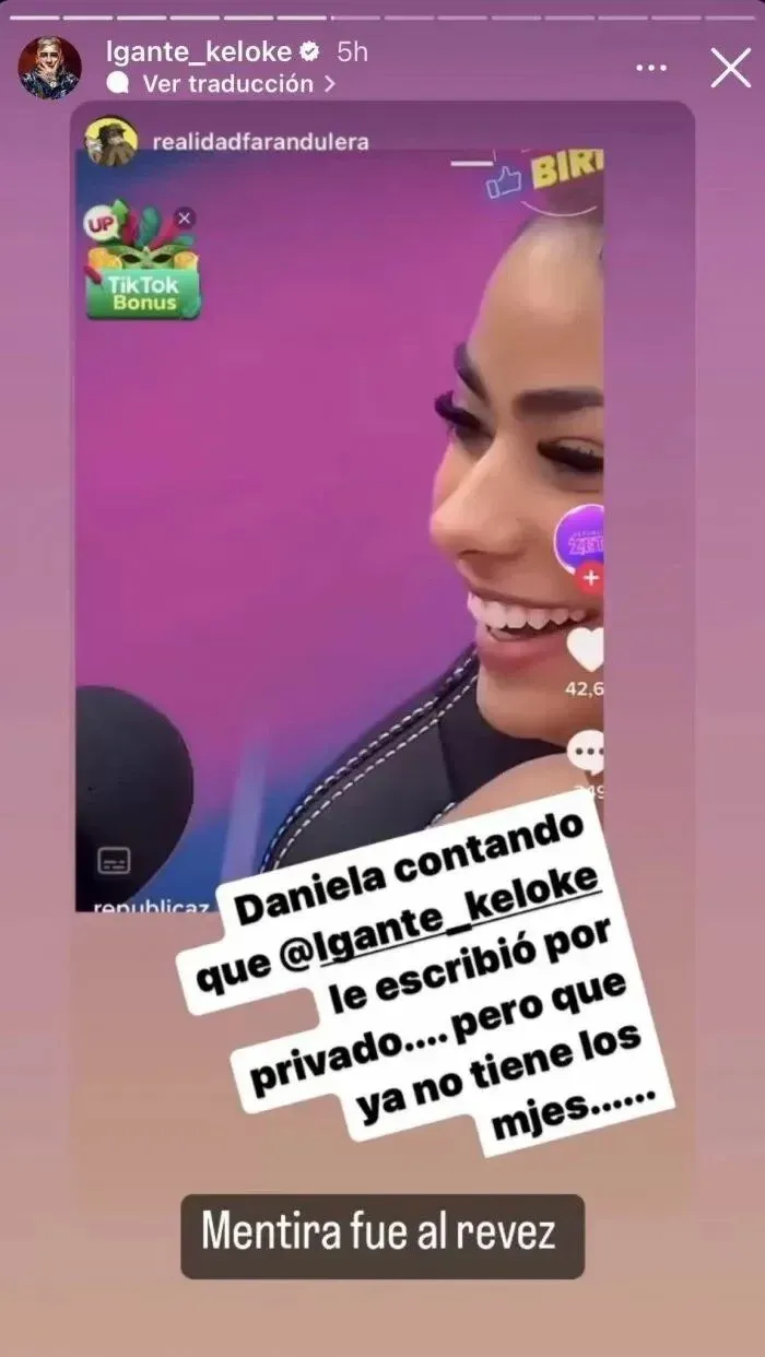 A través de sus redes sociales, L-Gante compartió las declaraciones de Daniela y respondió: "Mentira, fue al revés", en relación a quién de los dos inició la conversación.