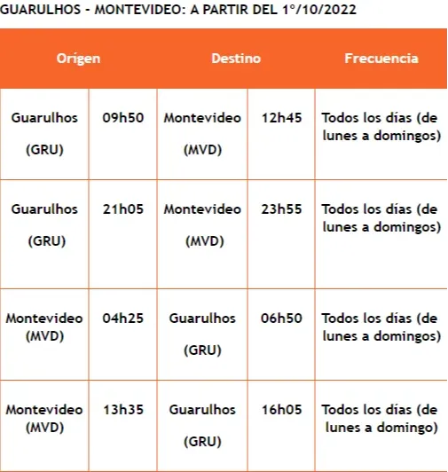 Actualmente, hay 14 operaciones semanales directas entre Guarulhos y Montevideo, un vuelo diario (de lunes a domingo) en cada sentido. A partir del 1° de septiembre, habrá un total de 20 vuelos semanales, es decir, 10 de ida y 10 de vuelta, con salida de Guarulhos por la mañana y por la tarde, y con salida de Montevideo hacia Brasil a primera hora de la mañana y de la tarde. Esta misma variedad de horarios se mantendrá a partir del 1° de octubre, cuando habrá dos vuelos diarios entre Brasil y Uruguay (o 28 vuelos semanales en ambas direcciones).