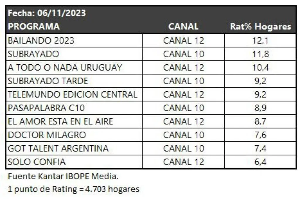 Con picos que estuvieron cerca de los 14 puntos (durante la sentencia por parte de las otras parejas de Maxi de la Cruz, que finalmente fue salvado por el jurado este martes), Marcelo Tinelli obtuvo un promedio de 12,1 puntos de rating, apenas por encima de Subrayado. El noticiero de Canal 10 tuvo un rating de 11,8, solo tres décimas abajo, pero que tuvo puntos altos con las nuevas ramificaciones del caso Marset y las renuncias de funcionarios públicos.