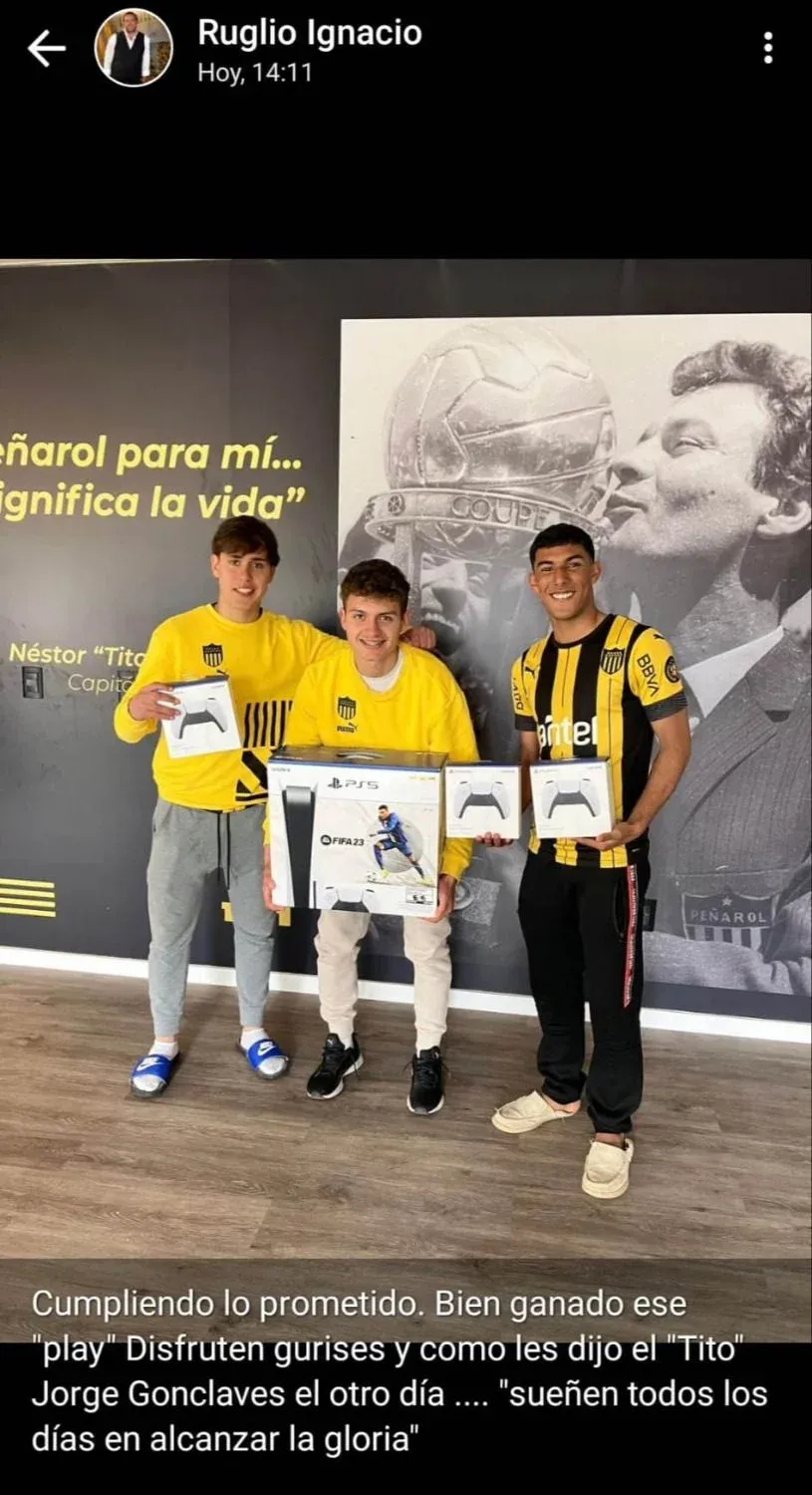 “Cumpliendo lo prometido. Bien ganado ese ‘play’. Disfruten gurises y como les dijo el 'Tito’ Jorge Gonçalves el otro día… ‘sueñen todos los días en alcanzar la gloria’”, escribió en su estado de Whatsapp, mostrando la foto de la nueva adquisición para los juveniles..