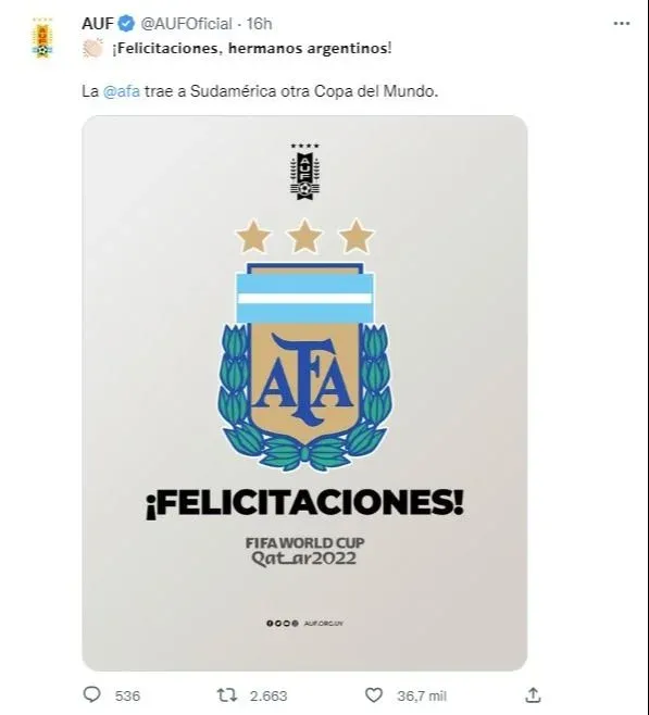 La Asociación Uruguaya de Fútbol (AUF) felicitó a la Asociación del Fútbol Argentino (AFA), luego de que su selección obtuviera el título del Mundial Qatar 2022 este domingo en la final ante Francia.