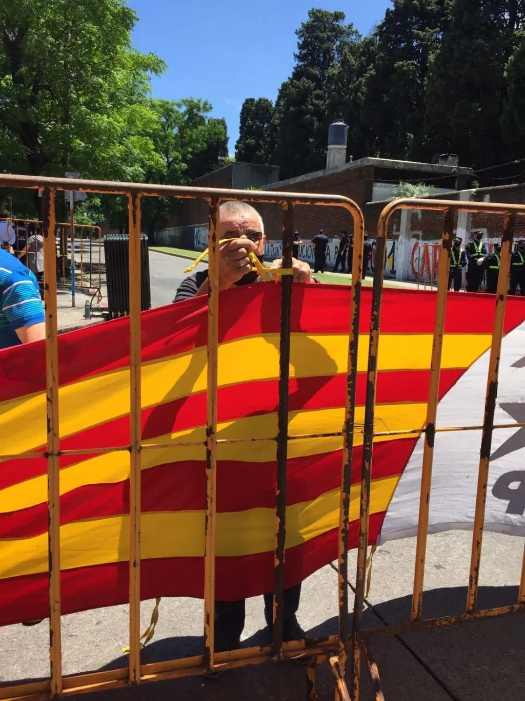 El dirigente se reunió este mediodía junto a otros hinchas y compañeros de Progreso en las afueras del Cementerio de La Teja, donde colgó su larga tela teñida de rojo y amarillo. Coincidió con el gerente institucional del club, Raúl Figuerola, quien dijo a la periodista Iliana da Silva que la bandera "tenía que estar" sí o sí y observó que una de las hijas de Ignacio Vázquez, hijo del exmandatario, pasó en la caravana del cortejo fúnebre y se emocionó al mirar hacia el emblema.