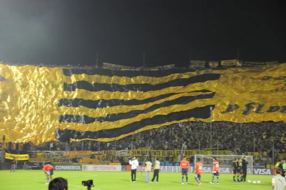 Entre los detalles de la gran bandera de Peñarol se destacaron las imágenes de un tren, las copas ganadas y algunas leyendas.