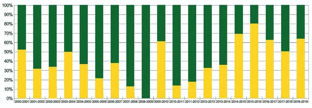 La Intendencia de Montevideo realiza todos los años un análisis de cuánta floración hubo en la temporada estival. Lo hace basándose en muestreos. Esta es la evolución histórica de la presencia de cianobacterias en las playas de Montevideo en el período 2000-2019 (en el verano 2015-2016 se detectaron mayor cantidad):
