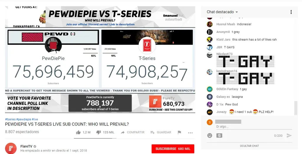 En Youtube se puede ver una transmisión en vivo que muestra esta lucha. Allí se puede ver el incremento de ambas cuentas en tiempo real. Como si se tratara de un partido de fútbol, los fanáticos comentan y hasta insultan a la cuenta rival. Estos comentarios son imposibles de leer porque llegan cientos por segundo y desaparecen de forma instantánea de la pantalla.